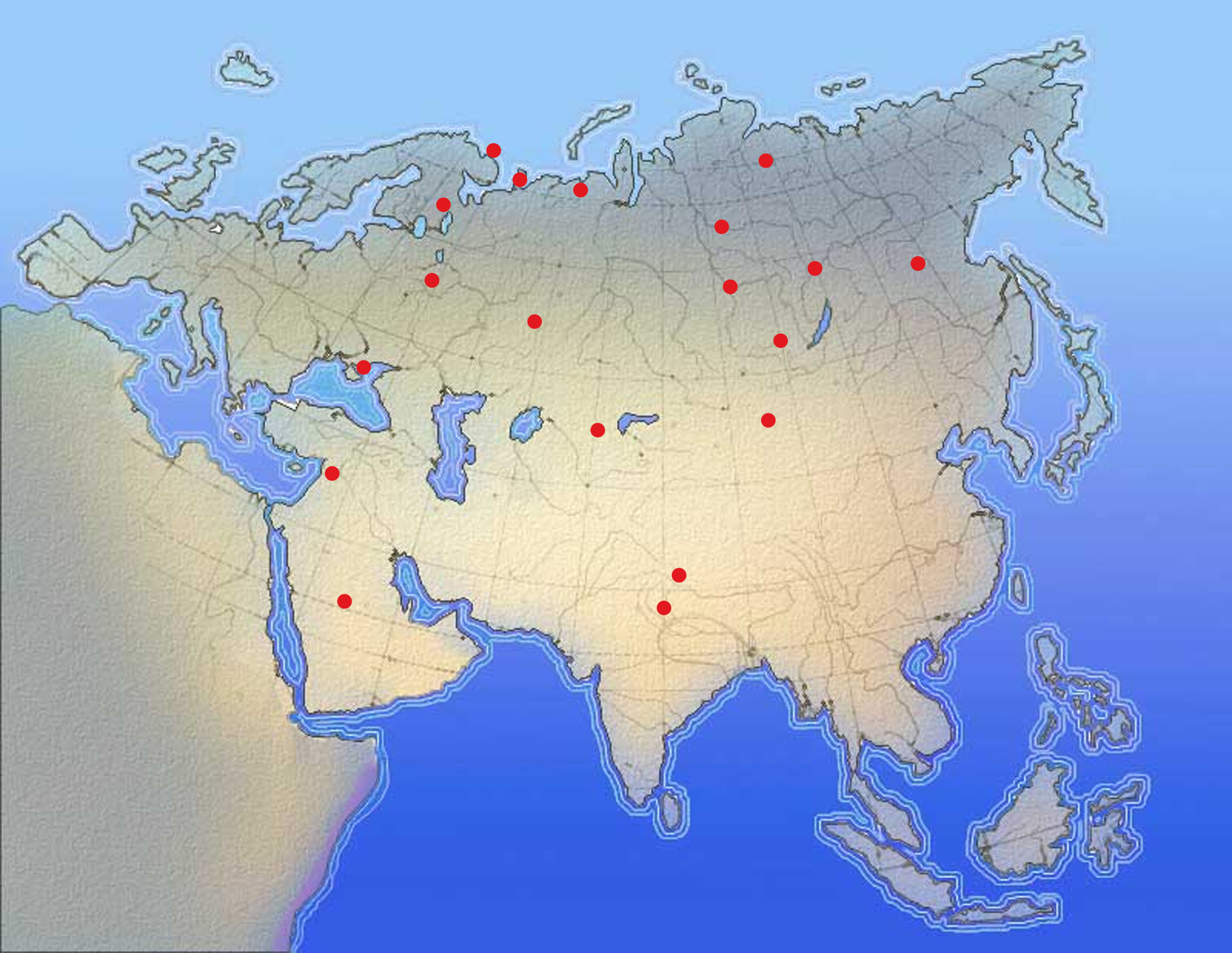 Карта мест находок строматолитов из коллекции ГБМТ.